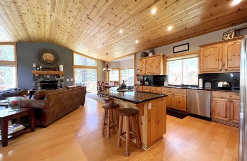 Welcome to Tahoe at the Stine Haus! Granite rock entry with log rails leads to the upstairs great room. Pine ceilings and wood floors warm the open floor plan highlighted by the gas fireplace with river rock surround and log mantle. Enjoy the big game on the flat-screen TV while you host one of your own games at the Foosball table. All day sun bounds thru windows on three sides and the slider in the dining room leads to a south facing deck. Step outside and enjoy the Tahoe air or an easy summer BBQ – outdoor table and chairs and BBQ weather permitting. Cook a gourmet meal in this fully equipped kitchen decked out with granite slab counters, stainless appliances and gas range. Dining table will accommodate 6 and seats at the bar for 4 more. The upstairs primary bedroom offers a luxurious king bed and an en-suite bathroom with double sinks, stall shower and large soaking tub.