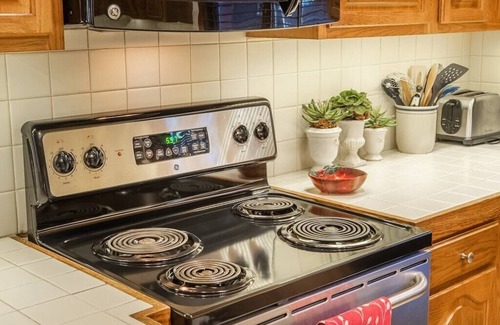 The full kitchen is equipped with range, microwave, dishwasher, disposal, coffee maker, popcorn maker, toaster, blender, electric kettle, French press, cast iron and non-stick skillets, pots and pans, kitchen essentials, plus some leftover staples that you're welcome to use—sugar, salt, pepper, olive oil, etc.