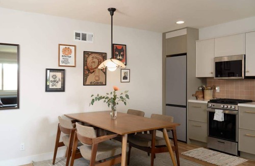 Welcome to “Rockridge Ryokan”, our thoughtfully designed Oakland one-bedroom flat, overlooking a beautiful Japanese garden with peekaboo views of the Bay. With a blend of mid-century modern decor and Japanese-inspired aesthetics, the space is designed for those who appreciate attention to detail. Neutral tones and unique decor elements create a warm and inviting atmosphere. While the home offers a peaceful view, please note that a family lives upstairs, so there may be occasional noise.