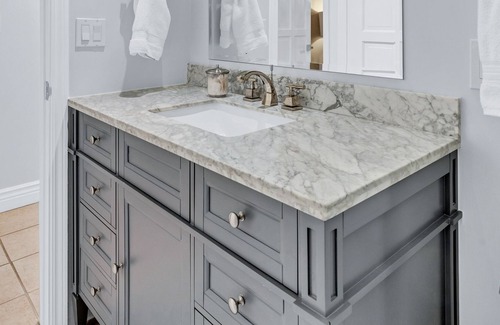 The master suite has a plush king size bed, ceiling fan and a wall-mounted flat TV. The recently remodeled master bath has a double vanity, toto toilet and a large shower with a rain showerhead.