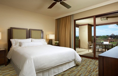 One-bedroom, one-bathroom villa at The Westin Desert Willow Villas. King bed in the bedroom, queen sleeper-sofa in the living room. Washer and dryer. Kitchenette with a full size refrigerator with ice maker, cooktop, microwave, dishwasher, pots, pans, dinnerware and 4-seat dining table. Outdoor grills are in the common areas between buildings. Non-smoking resort; no pets allowed.