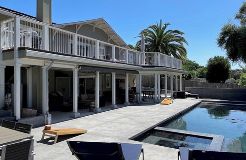 The home is shaded by mature olive and redwood trees. Its features include a new pool and spa completed in 2024, a fully equipped chef's kitchen, a covered outdoor game/TV room with pool table and ping pong, solar power, an electric car charging station, a home entertainment center, an indoor dining area for 6, outdoor teak dining table, gas fireplace (no propane tank needed), hardwood floors, wine refrigerator, upscale linens, modern decor, and much more.